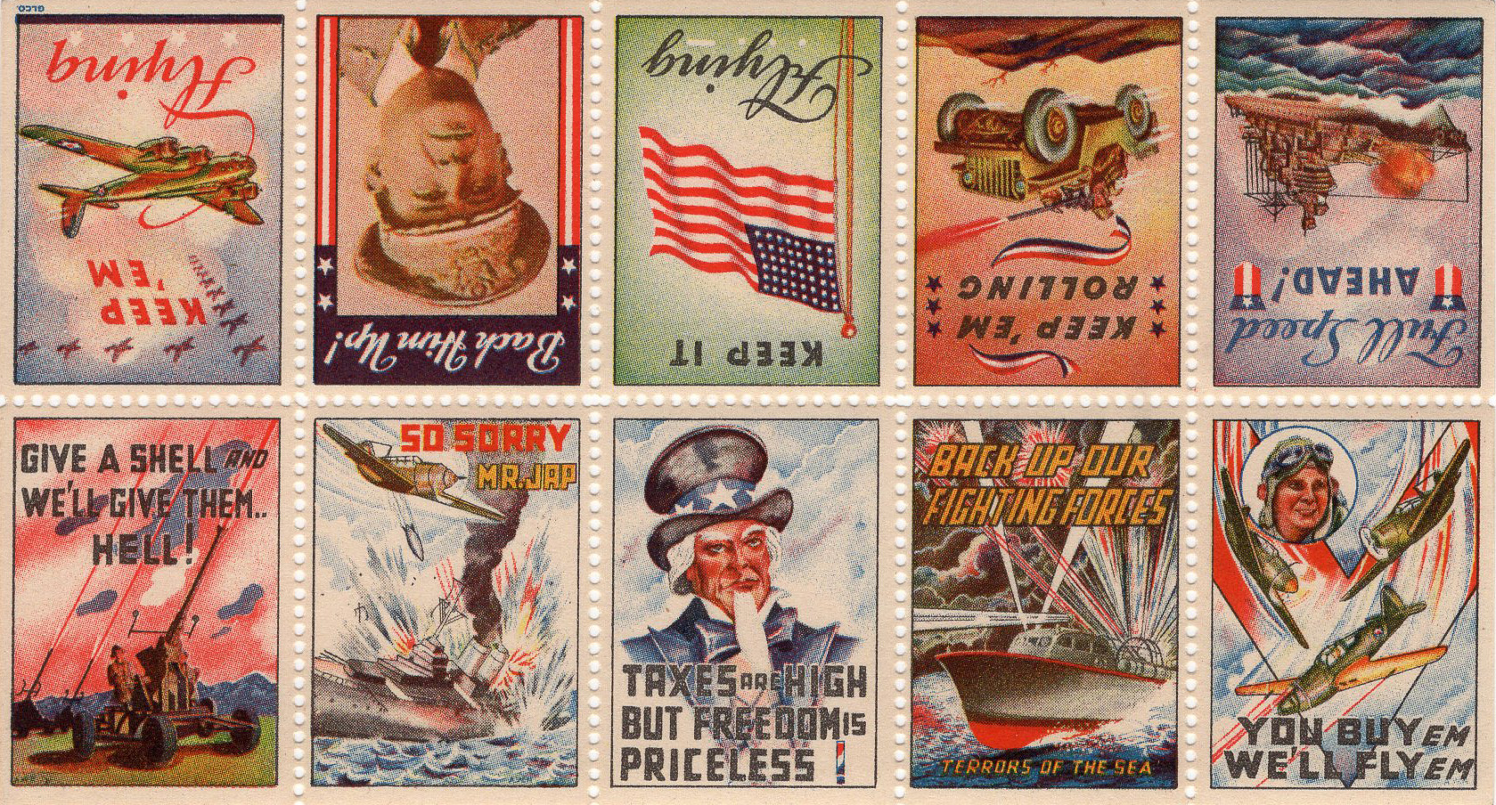 - #FWP -- "Famous War Posters" Poster Stamps -- These stamps have been seen on many 1942-1945 covers.