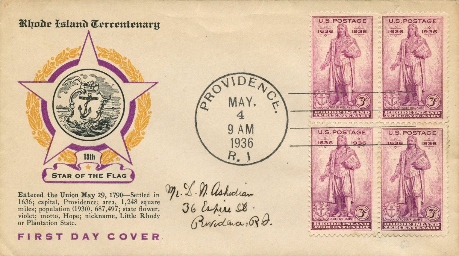 - U.S. Scott #777-19 - 1st Rhode Island and Providence Plantation Tercentenary Committee -- IX:56