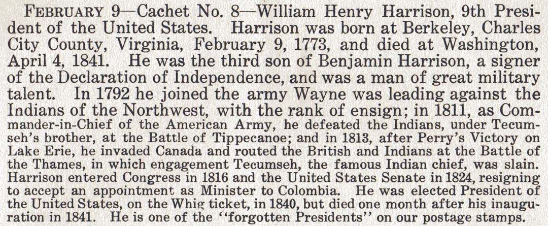 - 1937-02-09 -- Cachet #8-B -- (PBD) Anniversary of the birth of William Henry Harrison, 9th President of the United States.