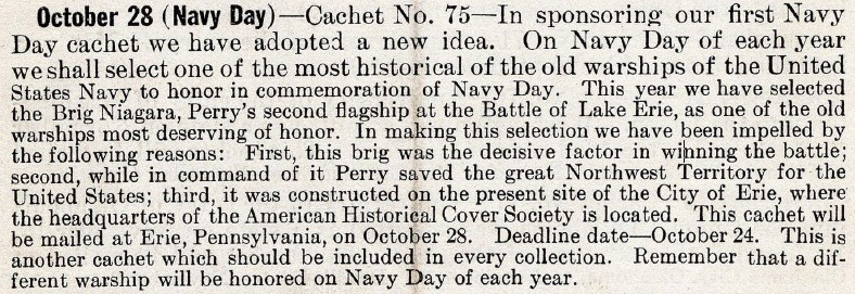 - #1935-10-28 -- Cachet #75 -- (?) "Perry's Old Flagship", the Niagara, canceled in the Laird's hometown, Erie, PA on Navy Day. --- (eBay)