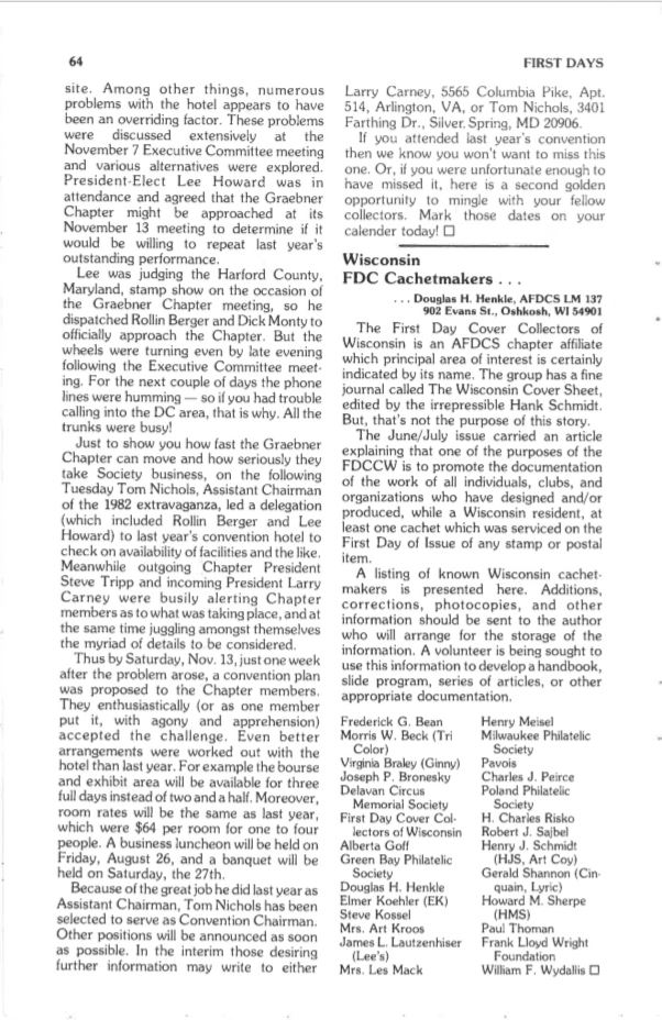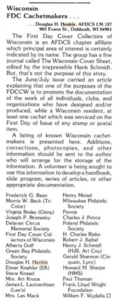 The June/July issue carried an article explaining that one of the purposes of the FDCCW is to promote the documentation of the work of all individuals, clubs, and organizations who have designed and/or produced, while a Wisconsin resident, at least one cachet which has been serviced on the First Day of Issue of any stamp or postal item.
