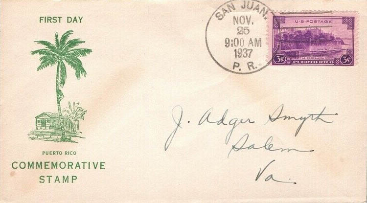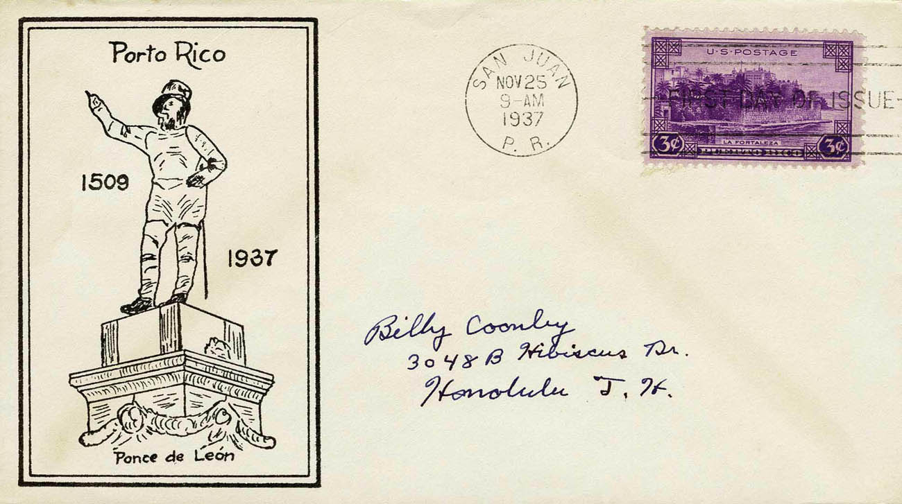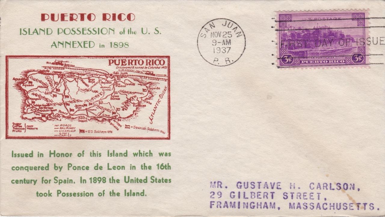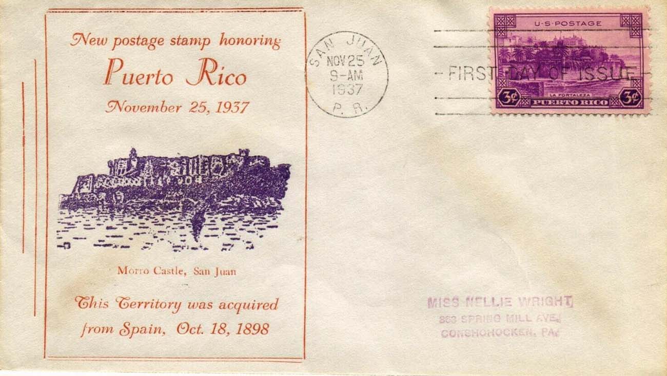 U.S. Scott #801 was issued on 11-25-1937 at San Juan, PR - (3¢)