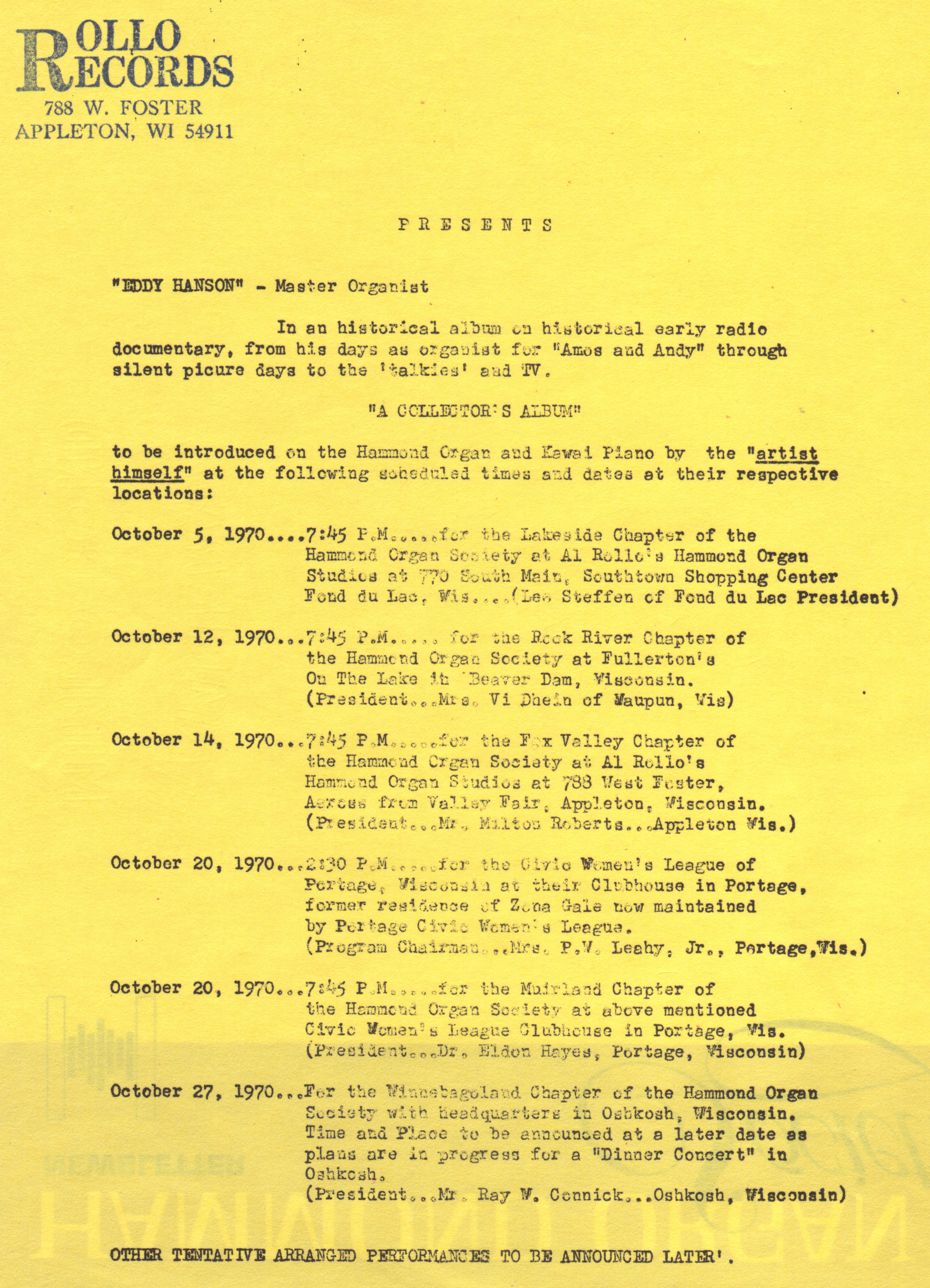 October 5, 1970 ... 7:45 P.M. ... for the Lakeside Chapter of the Hammond Organ Society at Al Rollo's Hammond Organ Studios at 770 South Main, Southtown Shopping Center, Fond du Lac, Wis. ... (Leo Steffen of Fond du Lac President)