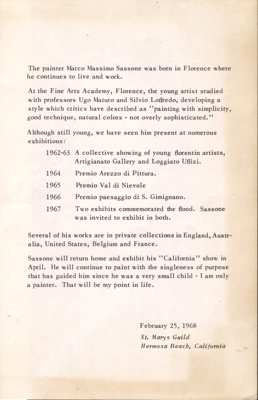 **   Marco Sassone, b. 1942, moved from Florence, Italy to Southern California in 1967, after the disastrous 11-04-1966 flood from the overflowing Arno River (more about the flood). He presented his paintings at several 1962-1967 Italian exhibitions, but I have not yet seen any printed source that pictures any named painting which he published before 1967.