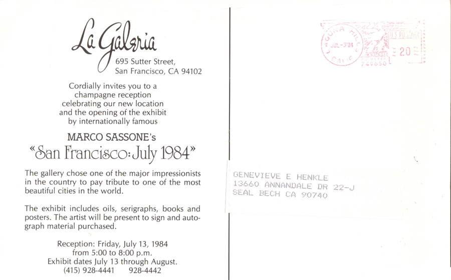 8.5 x 5.5" post card mailed 07-03-1984, for a reception on 07-13-1984,